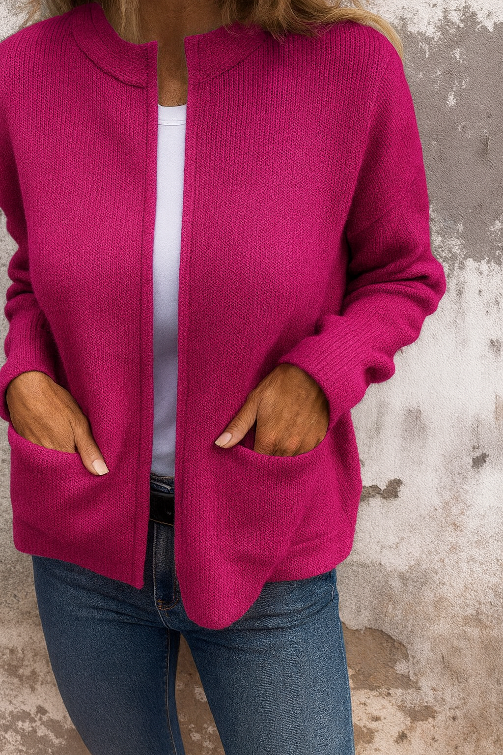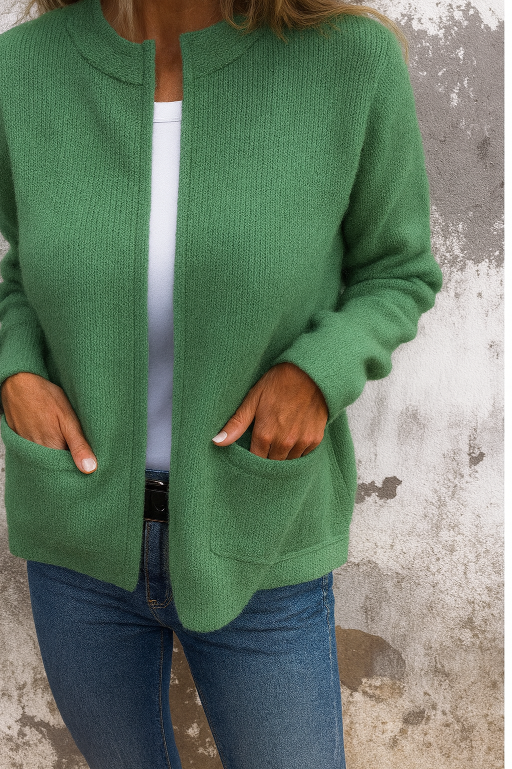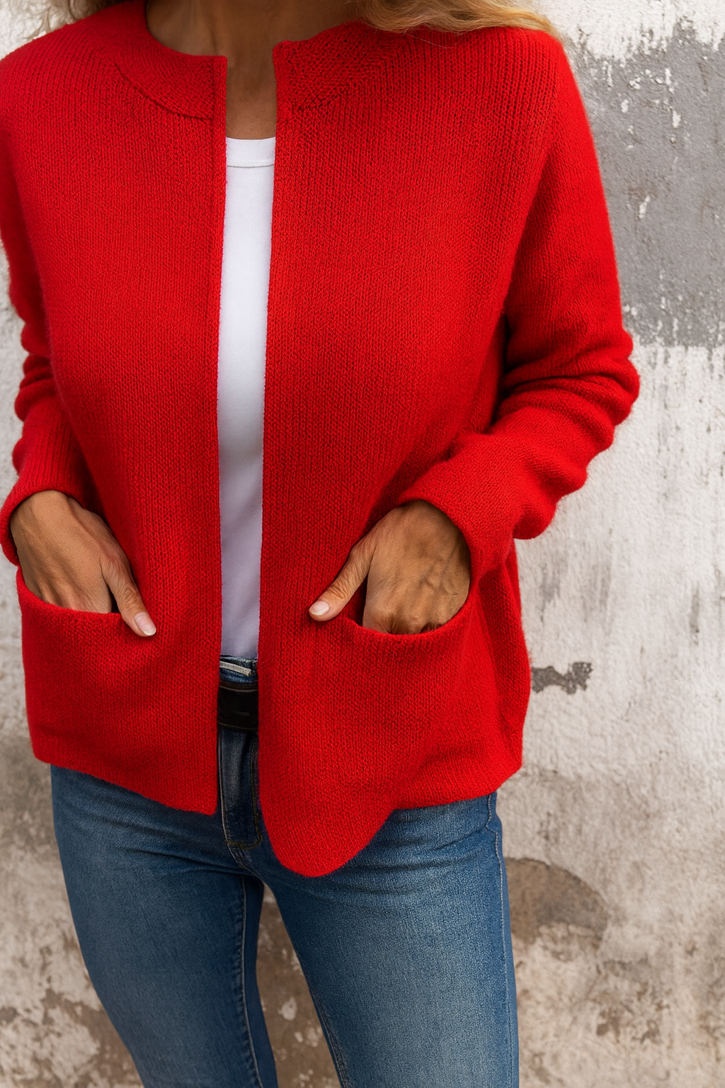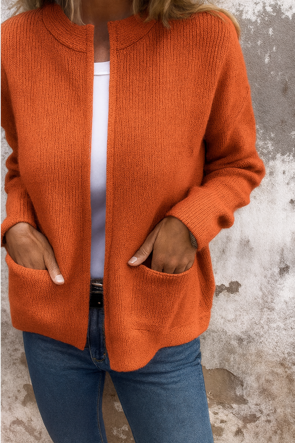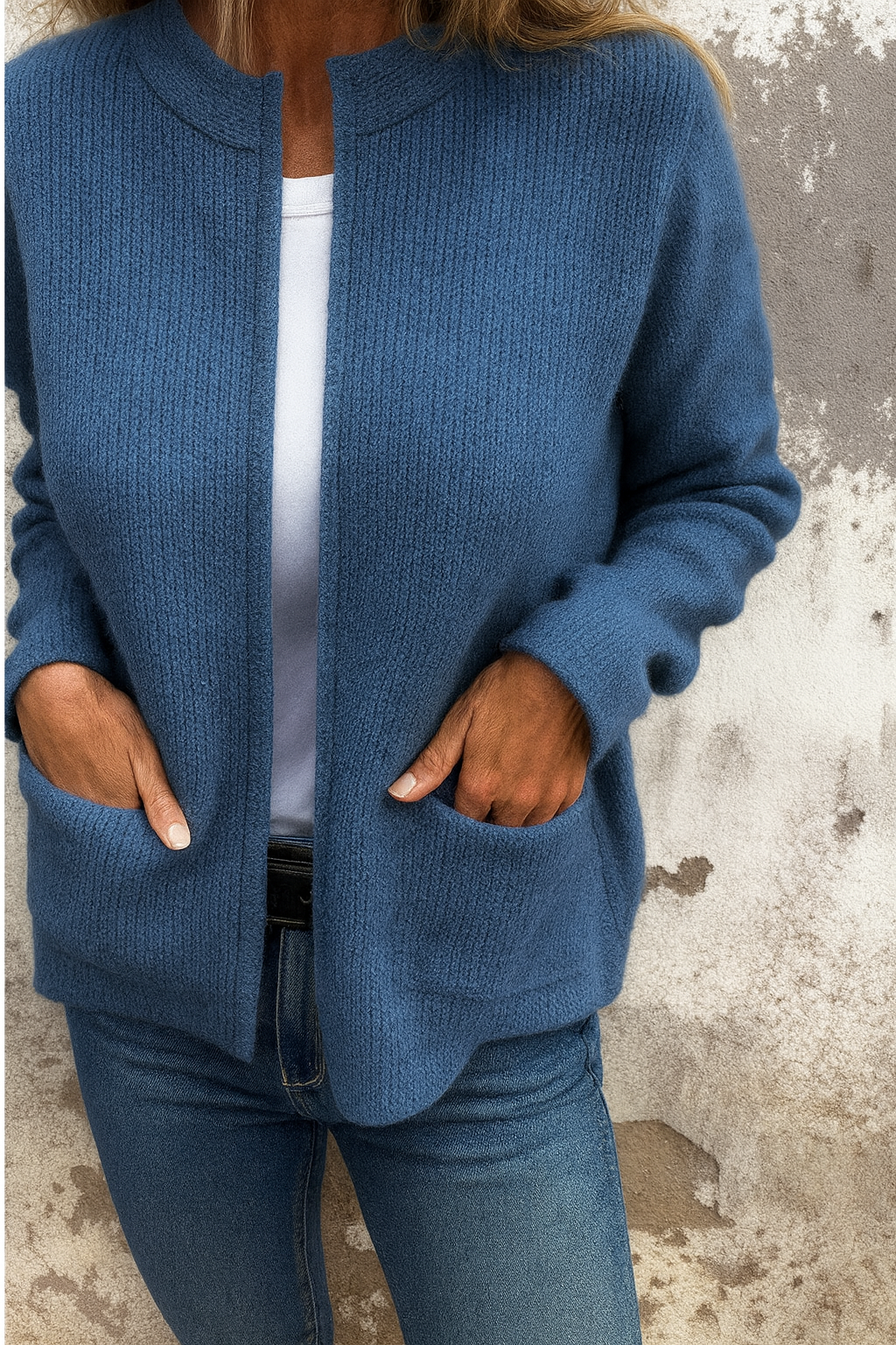 El cárdigan Almira combina suavidad, estilo y calidez en una prenda que eleva cualquier look con un toque de simplicidad moderna. Confeccionado en punto de poliéster y elastano, ofrece una textura suave y elástica que se adapta cómodamente al cuerpo. Su diseño holgado y sin botones aporta libertad de movimiento sin renunciar a la elegancia. Ideal para los días más frescos del otoño, es esa pieza que une confort y estilo sin esfuerzo.