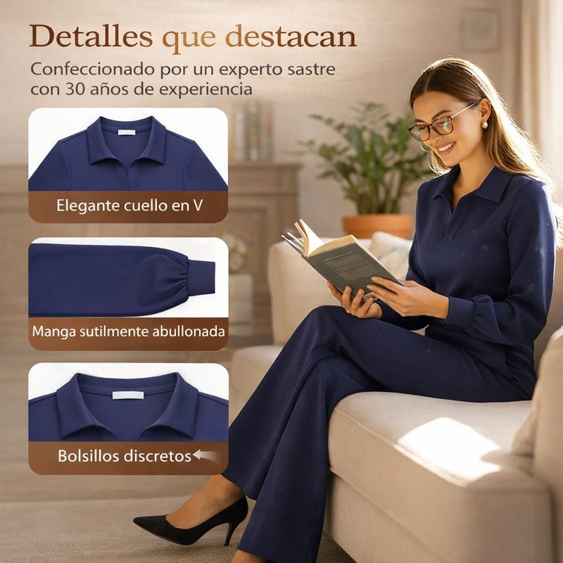 Isabel es un conjunto pensado para mujeres que buscan un look cómodo, elegante y fácil de llevar. La blusa con solapa aporta un aire cuidado y actual, mientras que el pantalón ancho estiliza la figura y garantiza libertad de movimiento durante todo el día.
