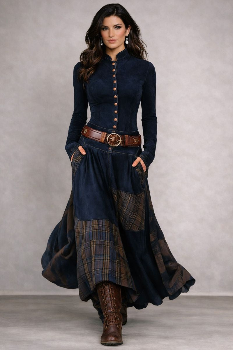 Este vestido largo combina la suavidad del ante sintético con paneles de patchwork a cuadros, creando un diseño lleno de carácter y movimiento. El corpiño ajustado con botones metálicos y cuello alto aporta estructura, mientras que la falda acampanada ofrece un movimiento natural perfecto para la temporada. Una pieza versátil, favorecedora y con un aire vintage bohemio ideal para todas las ocasiones.