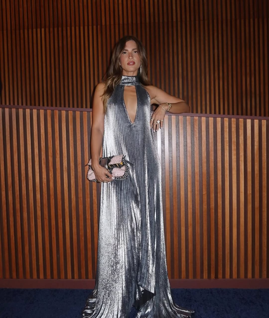 Nadia es un vestido maxi pensado para brillar. Su acabado metalizado plisado aporta movimiento y luminosidad, mientras que el escote halter con abertura profunda en V realza la silueta con un toque sofisticado y atrevido. La espalda descubierta y su caída fluida crean un efecto elegante y envolvente, ideal para celebraciones y eventos especiales.