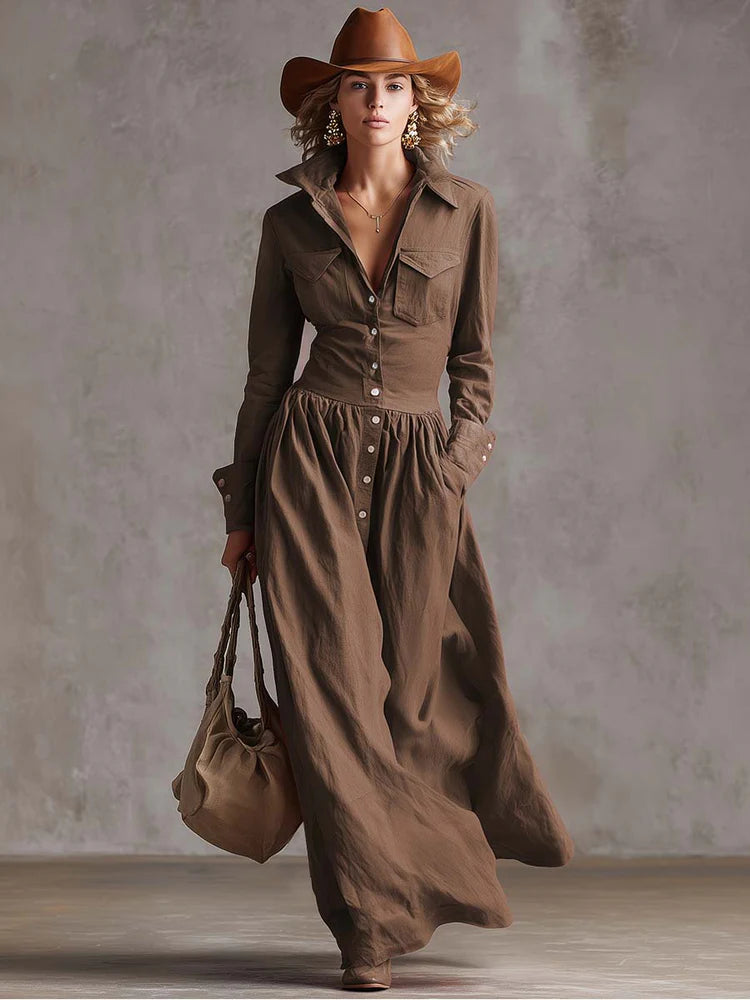 El vestido Natalia combina la esencia del estilo retro con la elegancia moderna. Su diseño largo con botones delanteros, solapa tipo occidental y falda amplia crea una silueta sofisticada y fluida. Ideal para quienes buscan destacar con un encanto atemporal en cualquier ocasión.