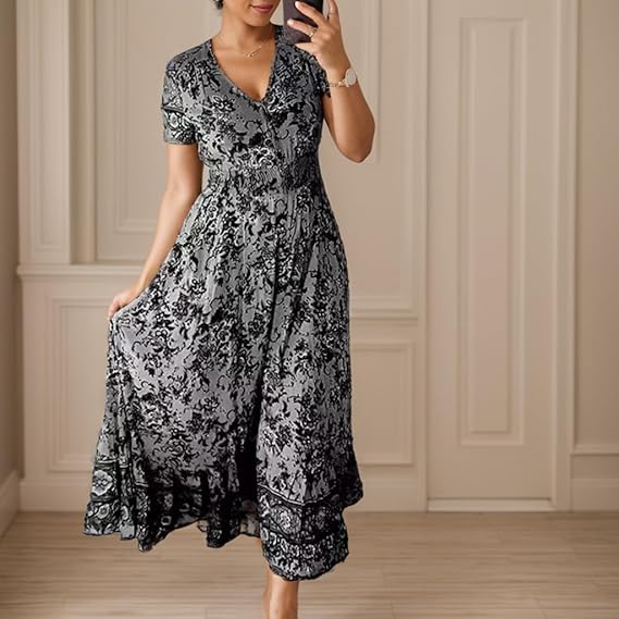 Valeria™ Vestido largo floral con escote en V, manga corta y vuelo amplio