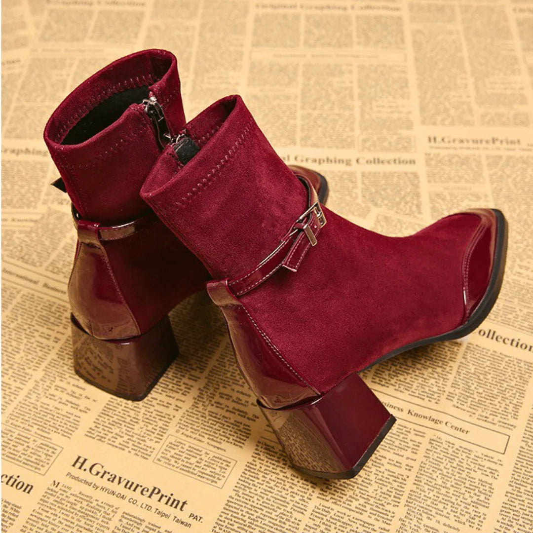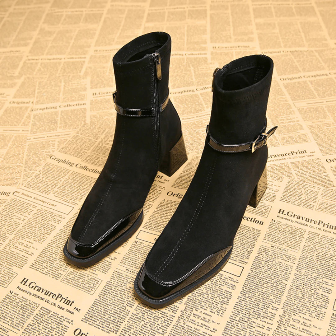 El botín Valeria destaca por su equilibrio perfecto entre sofisticación y estilo actual. Confeccionado en ante de alta calidad, incorpora sutiles detalles que aportan contraste y un acabado refinado. Su diseño de puntera cuadrada y la hebilla decorativa le dan un aire contemporáneo, ideal para elevar cualquier look con seguridad y personalidad.